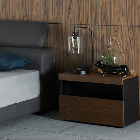 Side table mungil tapi penuh gaya. Dengan kombinasi American walnut veneer dan drawer warna putih matte, CARLA punya daya tarik visual yang kuat. Cocok untuk ditempatkan di samping tempat tidur atau sofa.