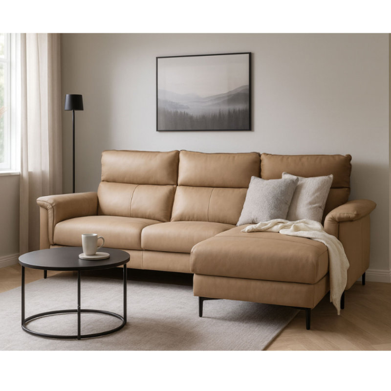 Sofa Kulit L-Shape dengan Kombinasi Kaki Kayu & Metal