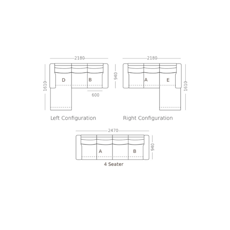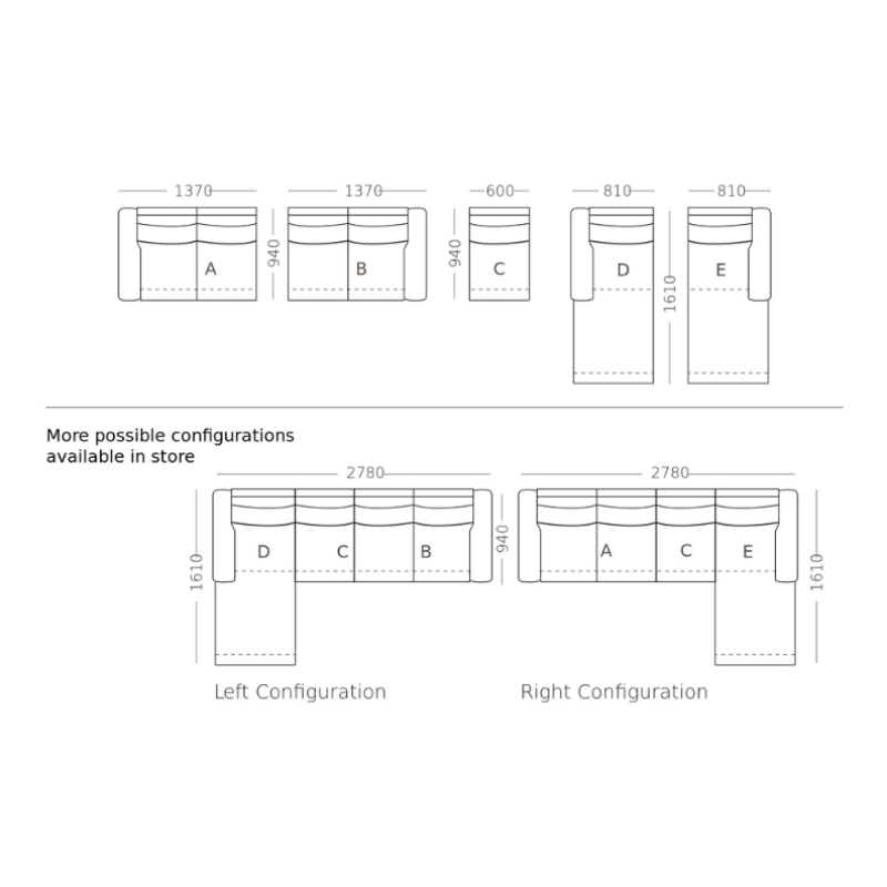 Setiap modul memiliki ukuran yang ringkas berkat armrest ramping dan lebar dudukan 600 mm yang nyaman. Desain ini membuat sofa mudah ditempatkan di ruang tamu berukuran terbatas, bahkan dalam konfigurasi L-shape tetap terlihat rapi tanpa memakan banyak ruang.