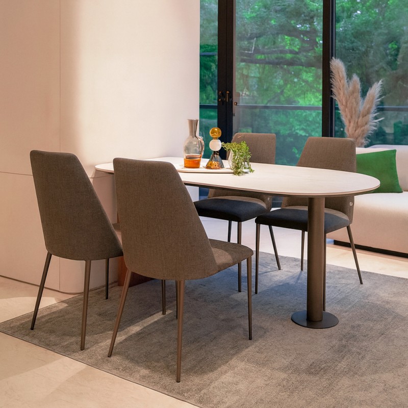 Dirancang secara matang dengan kaki walnut yang posisinya tidak sejajar serta satu kaki penyangga baja di bagian tengah, meja CAPSULE memaksimalkan ruang kaki dan kenyamanan. Kursi HENRY melengkapi set ini dengan pelapis kain yang lembut dan kaki baja meruncing, menawarkan kenyamanan dan daya tahan dalam desain yang ringan dan modern. Secara keseluruhan, set meja makan ini ideal untuk apartemen kecil maupun rumah yang luas, menghadirkan perpaduan kekuatan, gaya, dan fleksibilitas.