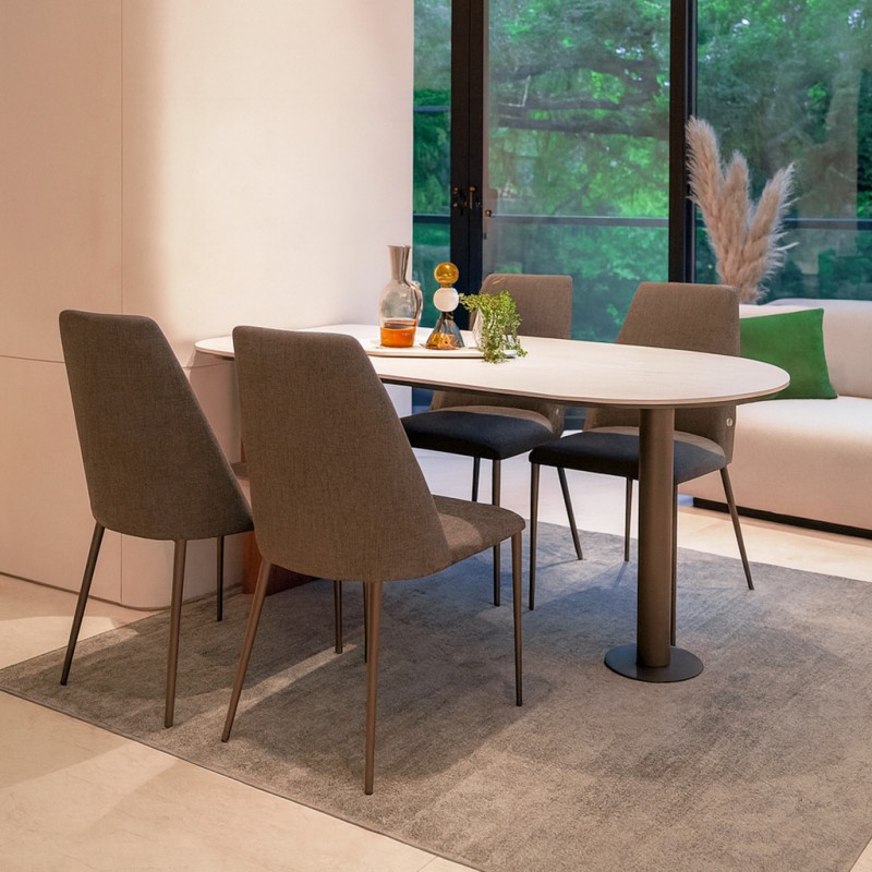 Dirancang secara matang dengan kaki walnut yang posisinya tidak sejajar serta satu kaki penyangga baja di bagian tengah, meja CAPSULE memaksimalkan ruang kaki dan kenyamanan. Kursi HENRY melengkapi set ini dengan pelapis kain yang lembut dan kaki baja meruncing, menawarkan kenyamanan dan daya tahan dalam desain yang ringan dan modern. Secara keseluruhan, set meja makan ini ideal untuk apartemen kecil maupun rumah yang luas, menghadirkan perpaduan kekuatan, gaya, dan fleksibilitas.