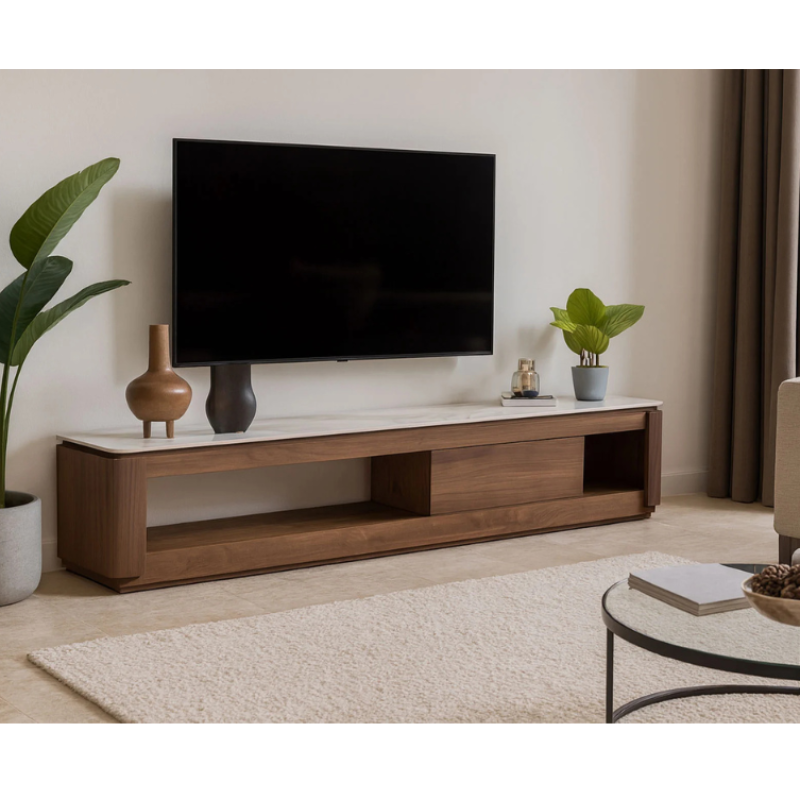 TV Console MAX Nezzo Amplifier menghadirkan perpaduan gaya dan kekuatan untuk ruang keluarga Anda. Didesain dengan dasar veneer kayu walnut Amerika yang elegan serta bagian atas sintered stone yang tidak hanya indah, tetapi juga sangat tahan lama—tahan panas, tahan gores, dan mudah dibersihkan.