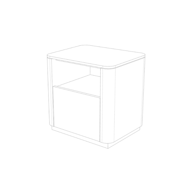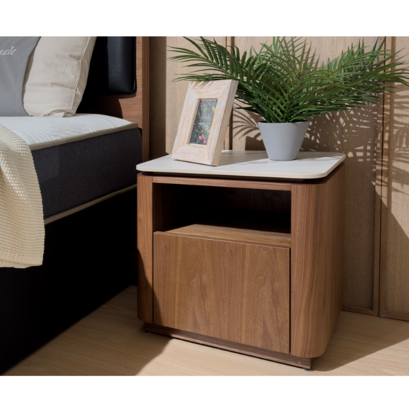 meja samping dengan corak veneer amerika walnut dan laci putih matt
