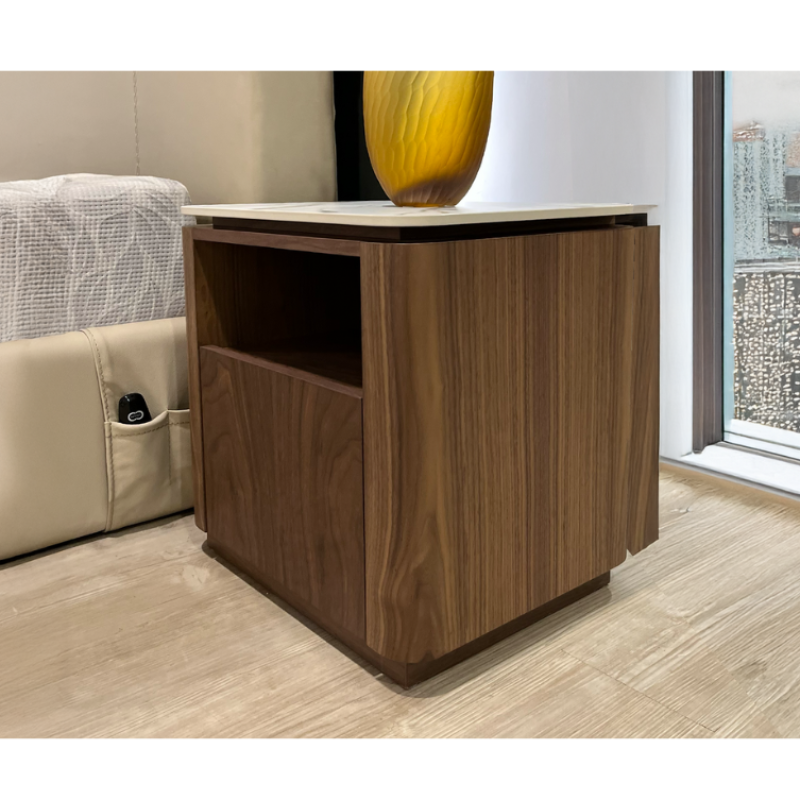 Dipadukan dengan veneer kayu walnut Amerika yang hangat, meja samping ini menawarkan keseimbangan antara daya tahan, estetika, dan fungsi. Cocok digunakan sebagai meja samping sofa maupun meja aksen di hunian modern.