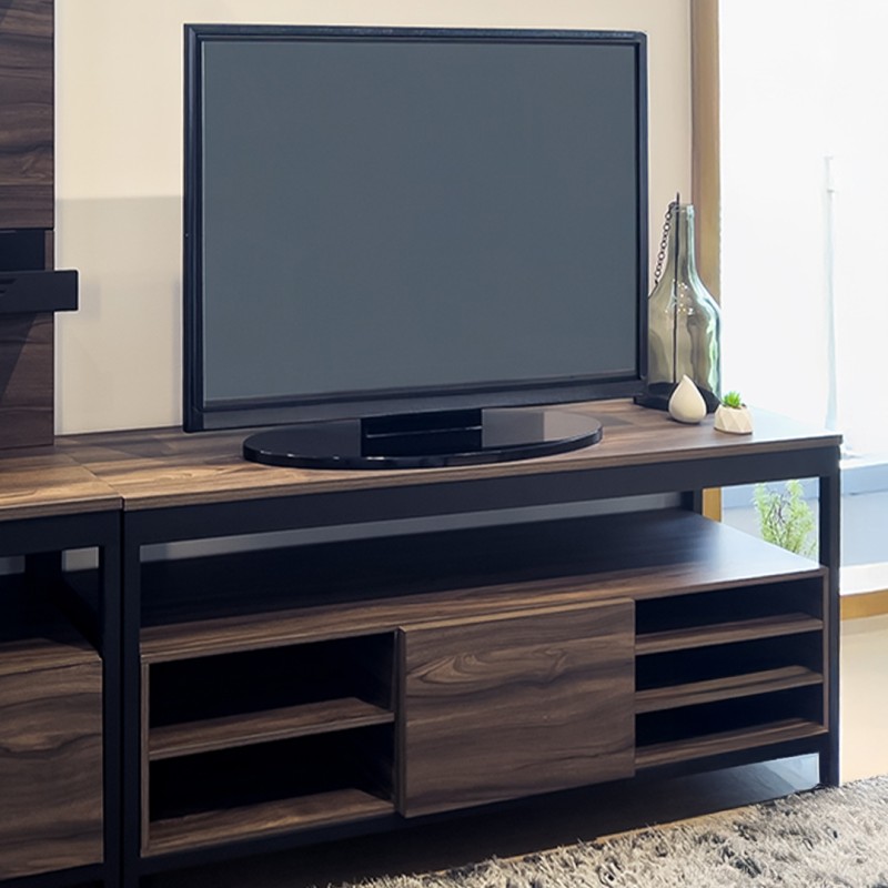 Material perpaduan MFM Frapp Walnut dan rangka baja berlapis powder coat hitam memberikan tampilan hangat dan kontemporer.