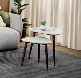 meja samping dengan corak veneer amerika walnut dan laci putih matt
